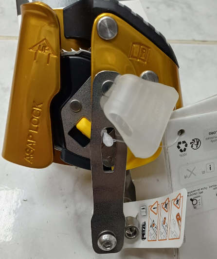 This is a safety device that follows you up and down a rope and stops you from falling if you slip or suddenly drop while working on a rope. It locks itself on the rope automatically so you don’t fall far.